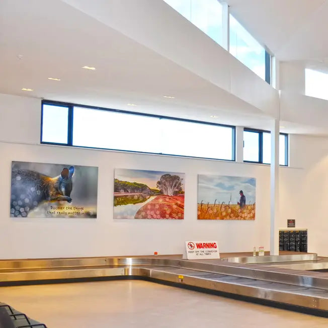 These art panels above the Airport's carousel welcome visitors with images of wildlife, landscape and agriculture. Using a matte finish and routed composite panel for a boxed finish, we created durable, stylish works which hang from art rails.